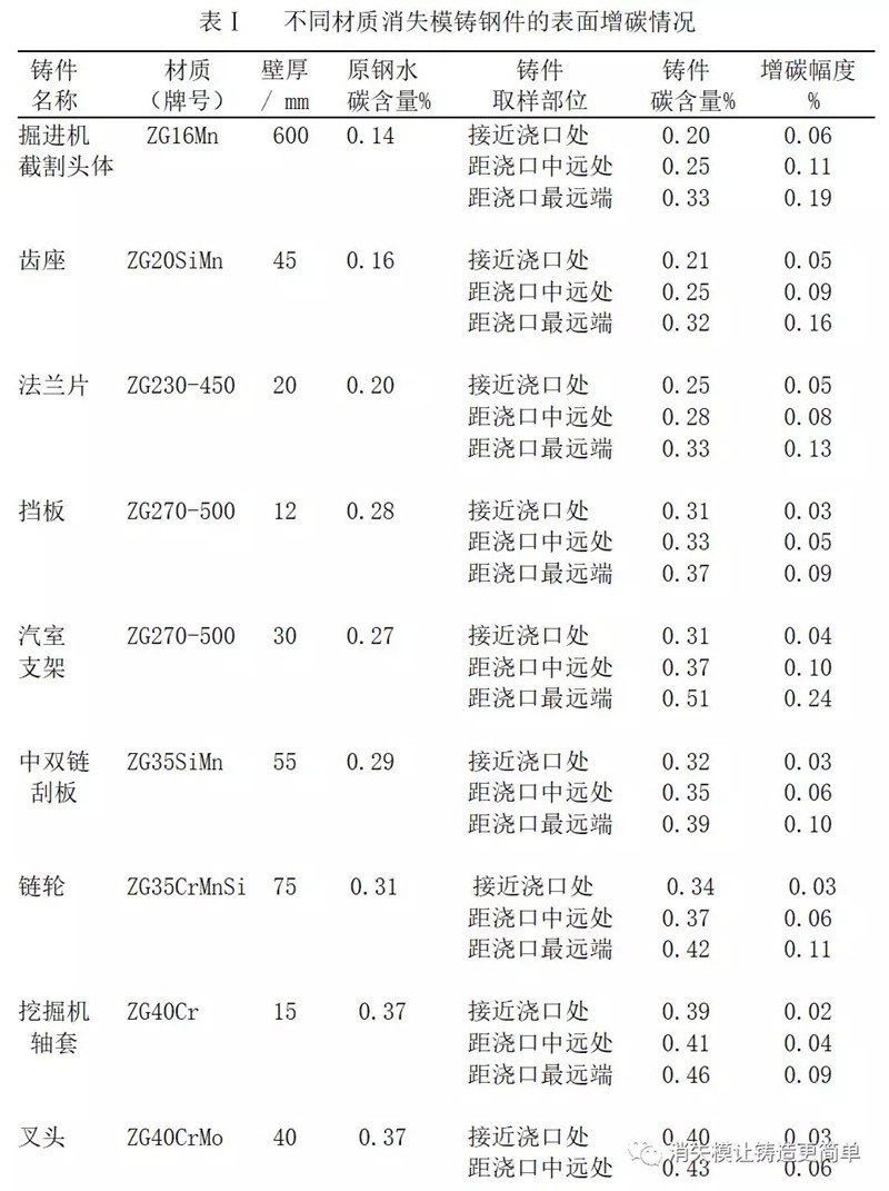 對C<0.65%的不同材質(zhì)消失模鑄鋼件不同部位的表面增碳情況進行檢測的結(jié)果見表Ⅰ,因試驗采用非水滴定法和氣體容量法分別對同一試樣加以對照測定的碳值幾乎相同,故表Ⅰ中未將對照數(shù)據(jù)一一列出。